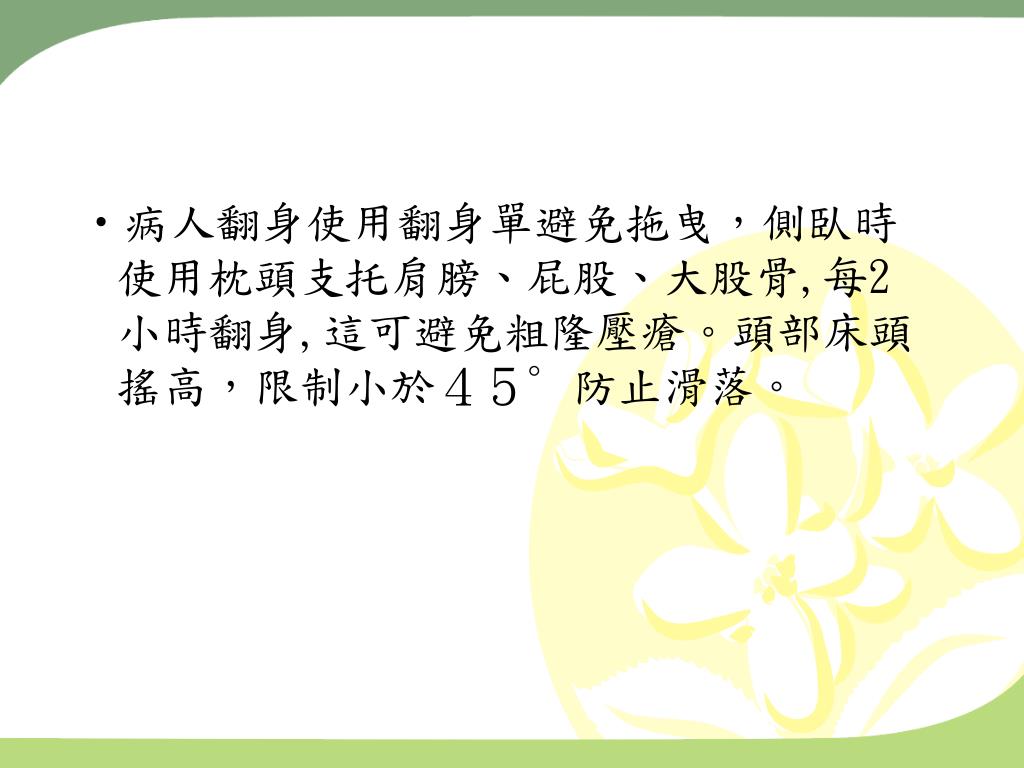 病人翻身使用翻身單避免拖曳,側臥時使用枕頭支托肩膀、屁股、大股骨,每2小時翻身,這可避免粗隆壓瘡。頭部床頭搖高,限制小於45∘防止滑落。病人翻身使用翻身單避免拖曳,側臥時使用枕頭支托肩膀、屁股、大股骨,每2小時翻身,這可避免粗隆壓瘡。頭部床頭搖高,限制小於45∘防止滑落。