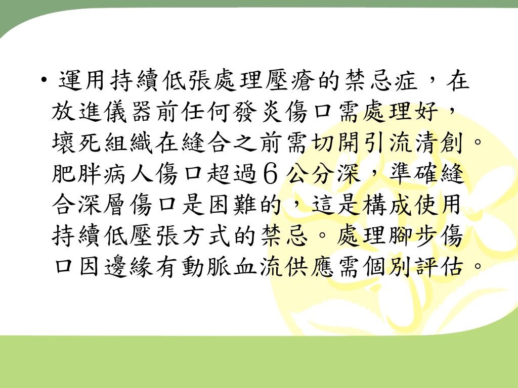 運用持續低張處理壓瘡的禁忌症,在放進儀器前任何發炎傷口需處理好,壞死組織在縫合之前需切開引流清創。肥胖病人傷口超過6公分深,準確縫合深層傷口是困難的,這是構成使用持續低壓張方式的禁忌。處理腳步傷口因邊緣有動脈血流供應需個別評估。運用持續低張處理壓瘡的禁忌症,在放進儀器前任何發炎傷口需處理好,壞死組織在縫合之前需切開引流清創。肥胖病人傷口超過6公分深,準確縫合深層傷口是困難的,這是構成使用持續低壓張方式的禁忌。處理腳步傷口因邊緣有動脈血流供應需個別評估。