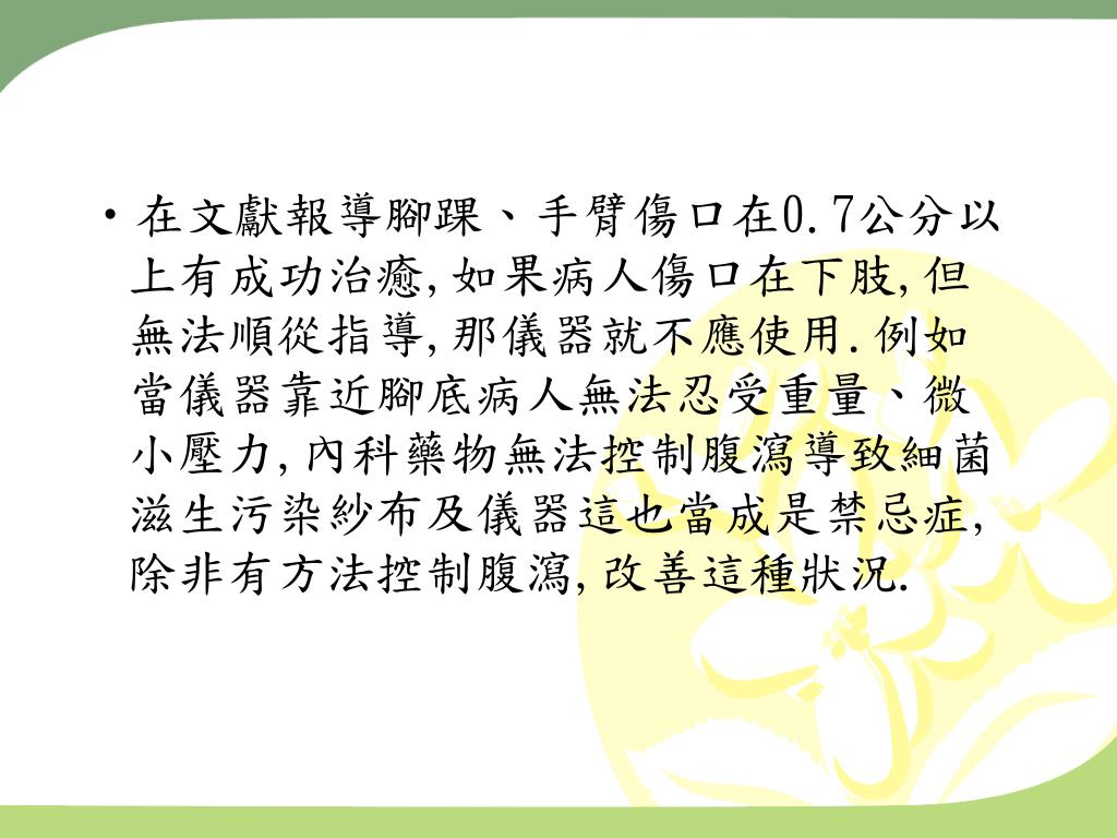 在文獻報導腳踝、手臂傷口在0.7公分以上有成功治癒,如果病人傷口在下肢,但無法順從指導,那儀器就不應使用.例如當儀器靠近腳底病人無法忍受重量、微小壓力,內科藥物無法控制腹瀉導致細菌滋生污染紗布及儀器這也當成是禁忌症,除非有方法控制腹瀉,改善這種狀況.在文獻報導腳踝、手臂傷口在0.7公分以上有成功治癒,如果病人傷口在下肢,但無法順從指導,那儀器就不應使用.例如當儀器靠近腳底病人無法忍受重量、微小壓力,內科藥物無法控制腹瀉導致細菌滋生污染紗布及儀器這也當成是禁忌症,除非有方法控制腹瀉,改善這種狀況.