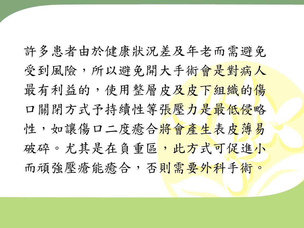 許多患者由於健康狀況差及年老而需避免 受到風險,所以避免開大手術會是對病人 最有利益的,使用整層皮及皮下組織的傷 口關閉方式予持續性等張壓力是最低侵略 性,如讓傷口二度癒合將會產生表皮薄易 破碎。尤其是在負重區,此方式可促進小 而頑強壓瘡能癒合,否則需要外科手術。