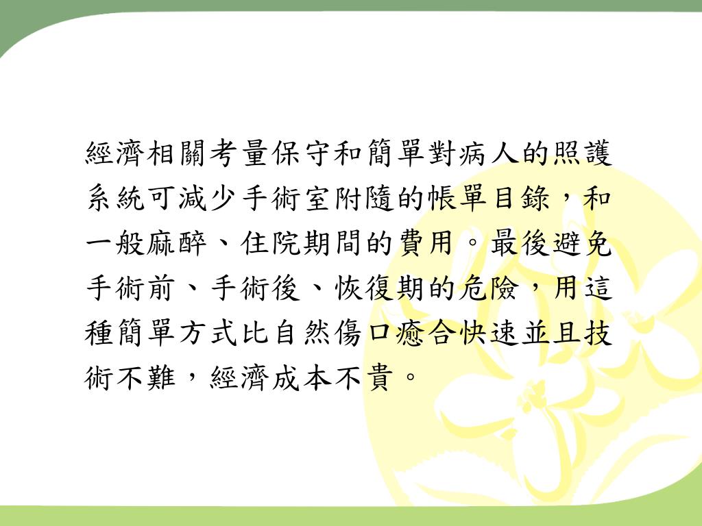 經濟相關考量保守和簡單對病人的照護 系統可減少手術室附隨的帳單目錄,和 一般麻醉、住院期間的費用。最後避免 手術前、手術後、恢復期的危險,用這 種簡單方式比自然傷口癒合快速並且技 術不難,經濟成本不貴。