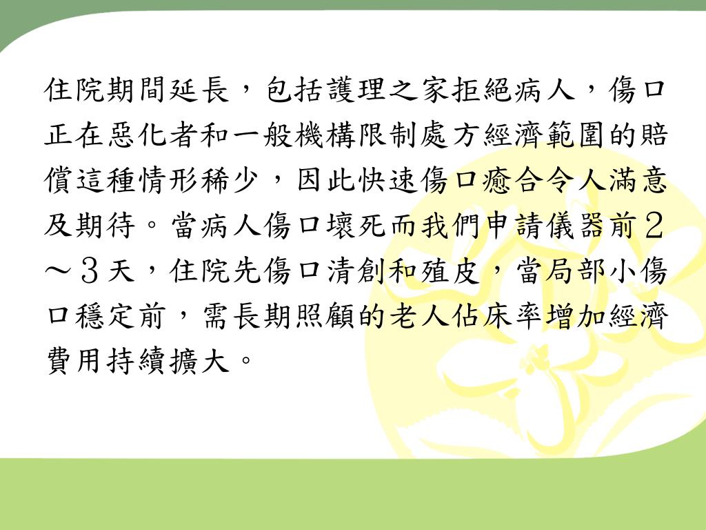 住院期間延長,包括護理之家拒絕病人,傷口 正在惡化者和一般機構限制處方經濟範圍的賠 償這種情形稀少,因此快速傷口癒合令人滿意 及期待。當病人傷口壞死而我們申請儀器前2 ~3天,住院先傷口清創和殖皮,當局部小傷 口穩定前,需長期照顧的老人佔床率增加經濟 費用持續擴大。