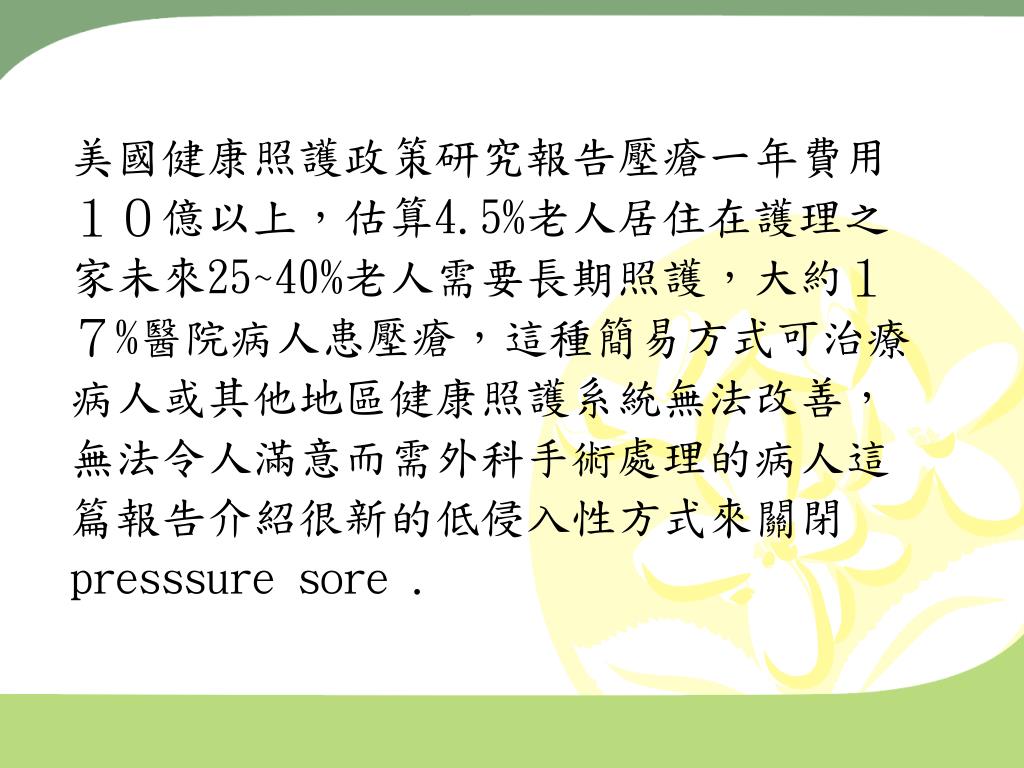 美國健康照護政策研究報告壓瘡一年費用 10億以上,估算4.5%老人居住在護理之 家未來25~40%老人需要長期照護,大約1 7%醫院病人患壓瘡,這種簡易方式可治療 病人或其他地區健康照護系統無法改善, 無法令人滿意而需外科手術處理的病人這 篇報告介紹很新的低侵入性方式來關閉 presssure sore .