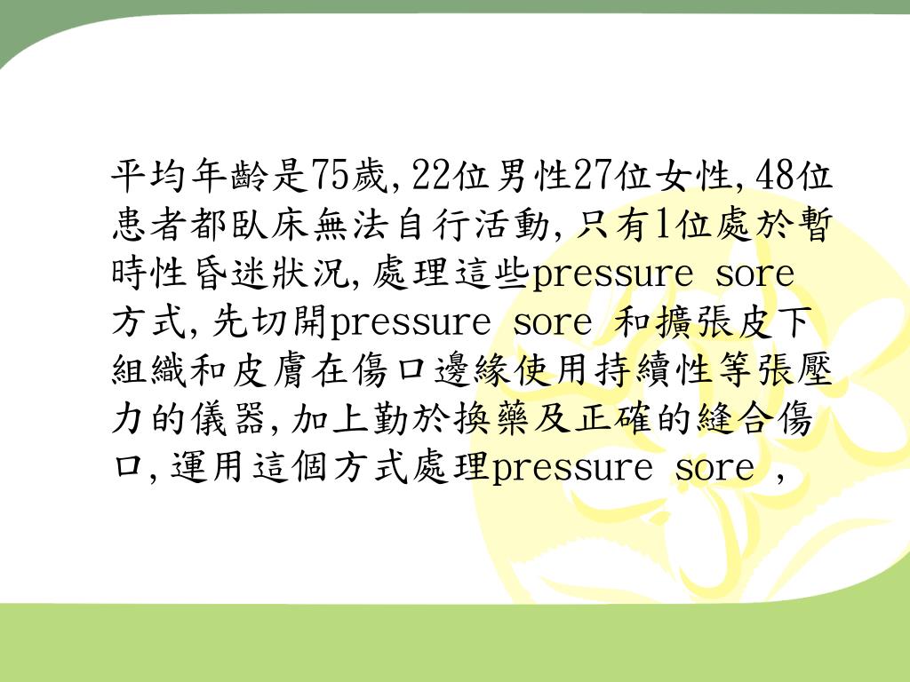 平均年齡是75歲,22位男性27位女性,48位患者都臥床無法自行活動,只有1位處於暫時性昏迷狀況,處理這些pressure sore 方式,先切開pressure sore 和擴張皮下組織和皮膚在傷口邊緣使用持續性等張壓力的儀器,加上勤於換藥及正確的縫合傷口,運用這個方式處理pressure sore ,
