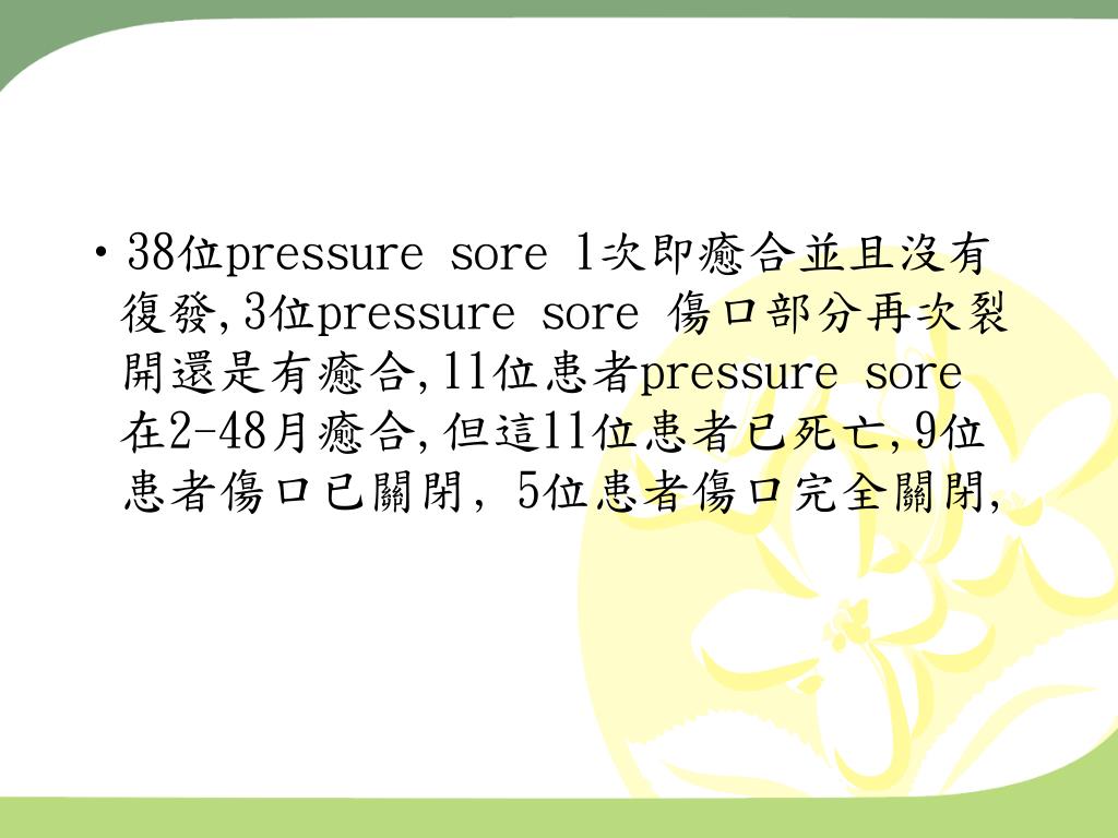 38位pressure sore 1次即癒合並且沒有復發,3位pressure sore 傷口部分再次裂開還是有癒合,11位患者pressure sore 在2-48月癒合,但這11位患者已死亡,9位患者傷口已關閉﹐5位患者傷口完全關閉,