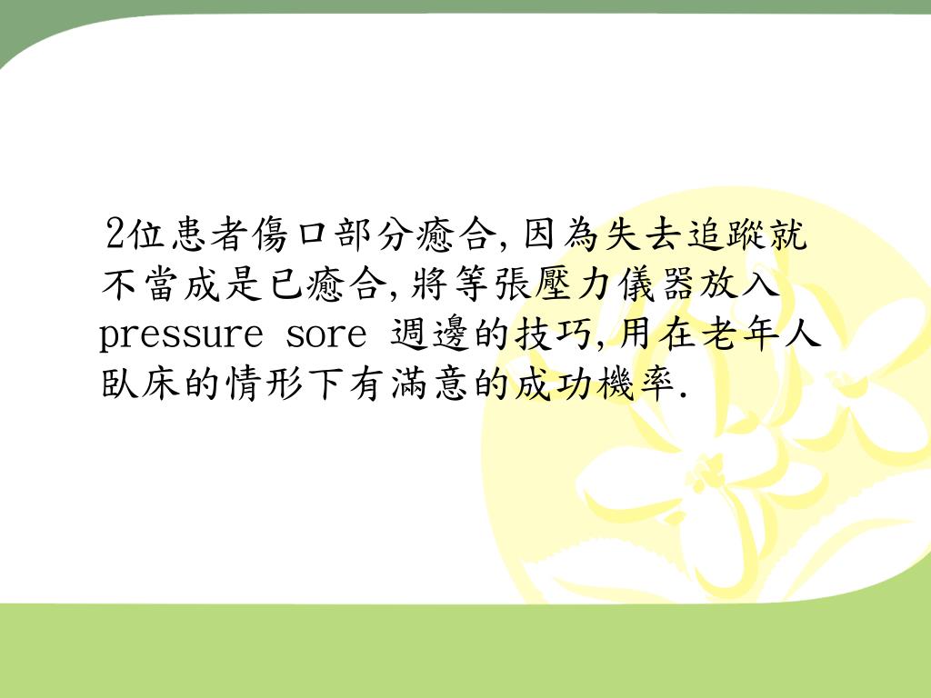 2位患者傷口部分癒合,因為失去追蹤就不當成是已癒合,將等張壓力儀器放入pressure sore 週邊的技巧,用在老年人臥床的情形下有滿意的成功機率.