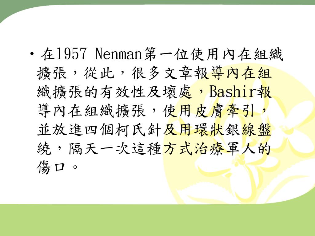 在1957 Nenman第一位使用內在組織擴張,從此,很多文章報導內在組織擴張的有效性及壞處,Bashir報導內在組織擴張,使用皮膚牽引,並放進四個柯氏針及用環狀銀線盤繞,隔天一次這種方式治療軍人的傷口。