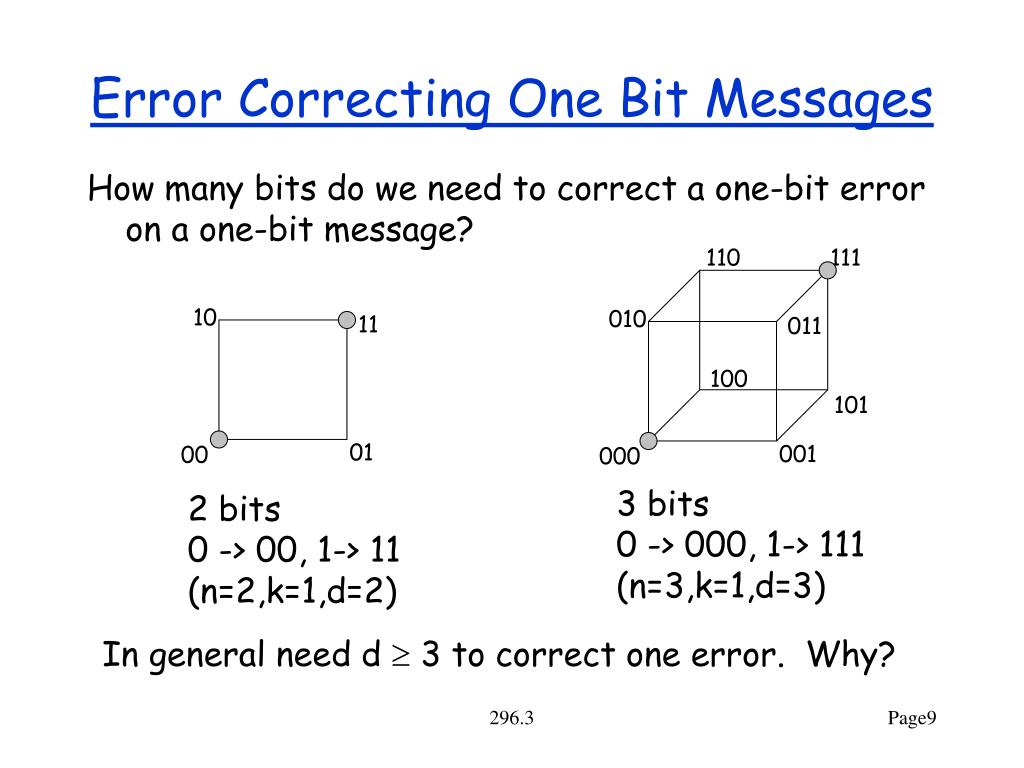 110 111 10 010 11 011 100 101 01 001 00 000 Error Correcting One Bit Messages • How many bits do we need to correct a one-bit error on a one-bit message? 3 bits 0 -> 000, 1-> 111 (n=3,k=1,d=3) 2 bits 0 -> 00, 1-> 11 (n=2,k=1,d=2) In general need d 3 to correct one error. Why? 296.3