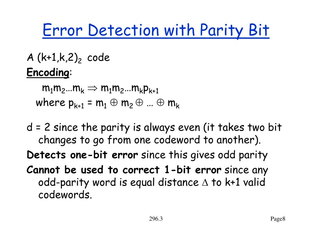 Error Detection with Parity Bit • A (k+1,k,2)2 code • Encoding: • m1m2…mk m1m2…mkpk+1 • where pk+1 = m1 m2 … mk • d = 2 since the parity is always even (it takes two bit changes to go from one codeword to another). • Detects one-bit error since this gives odd parity • Cannot be used to correct 1-bit error since any odd-parity word is equal distance D to k+1 valid codewords. 296.3