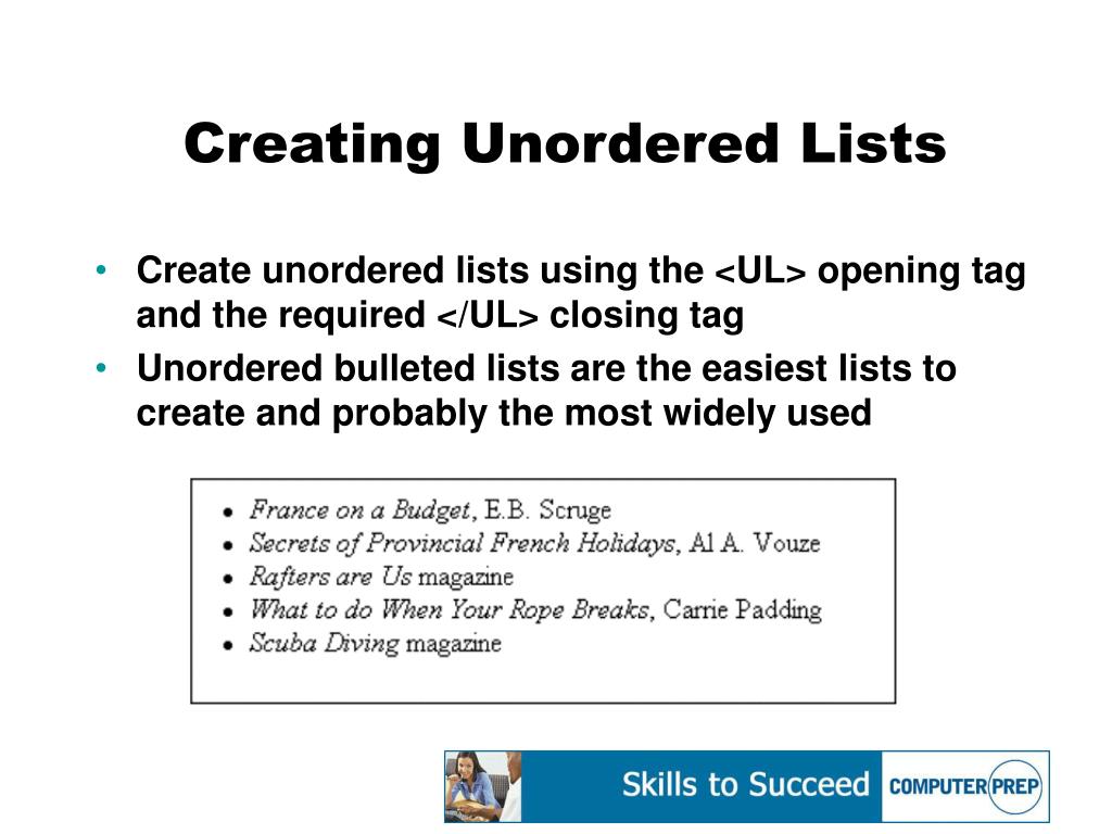 Creating Unordered Lists • Create unordered lists using the <UL> opening tag and the required </UL> closing tag • Unordered bulleted lists are the easiest lists to create and probably the most widely used
