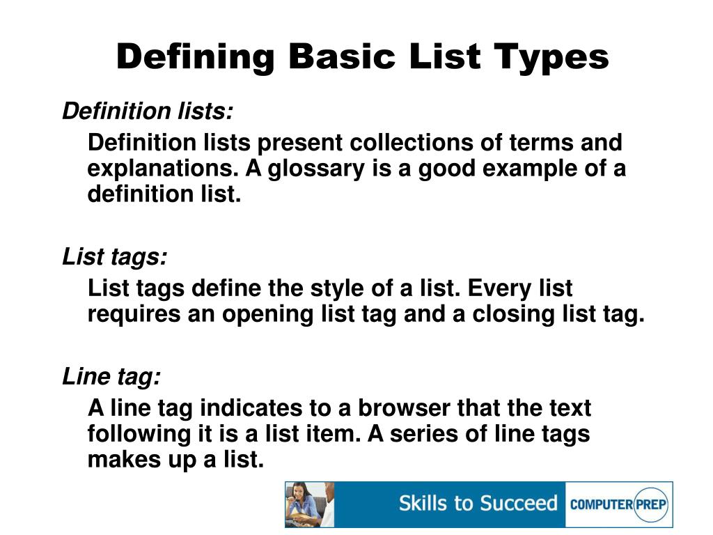 Defining Basic List Types Definition lists: Definition lists present collections of terms and explanations. A glossary is a good example of a definition list. List tags: List tags define the style of a list. Every list requires an opening list tag and a closing list tag. Line tag: A line tag indicates to a browser that the text following it is a list item. A series of line tags makes up a list.