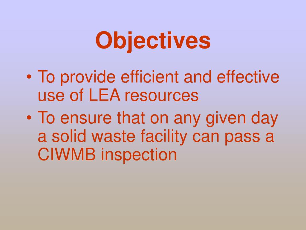 Objectives • To provide efficient and effective use of LEA resources • To ensure that on any given day a solid waste facility can pass a CIWMB inspection