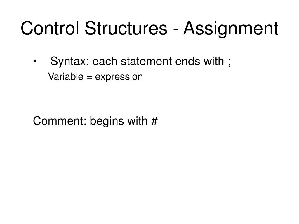 Control Structures - Assignment • Syntax: each statement ends with ; Variable = expression Comment: begins with #