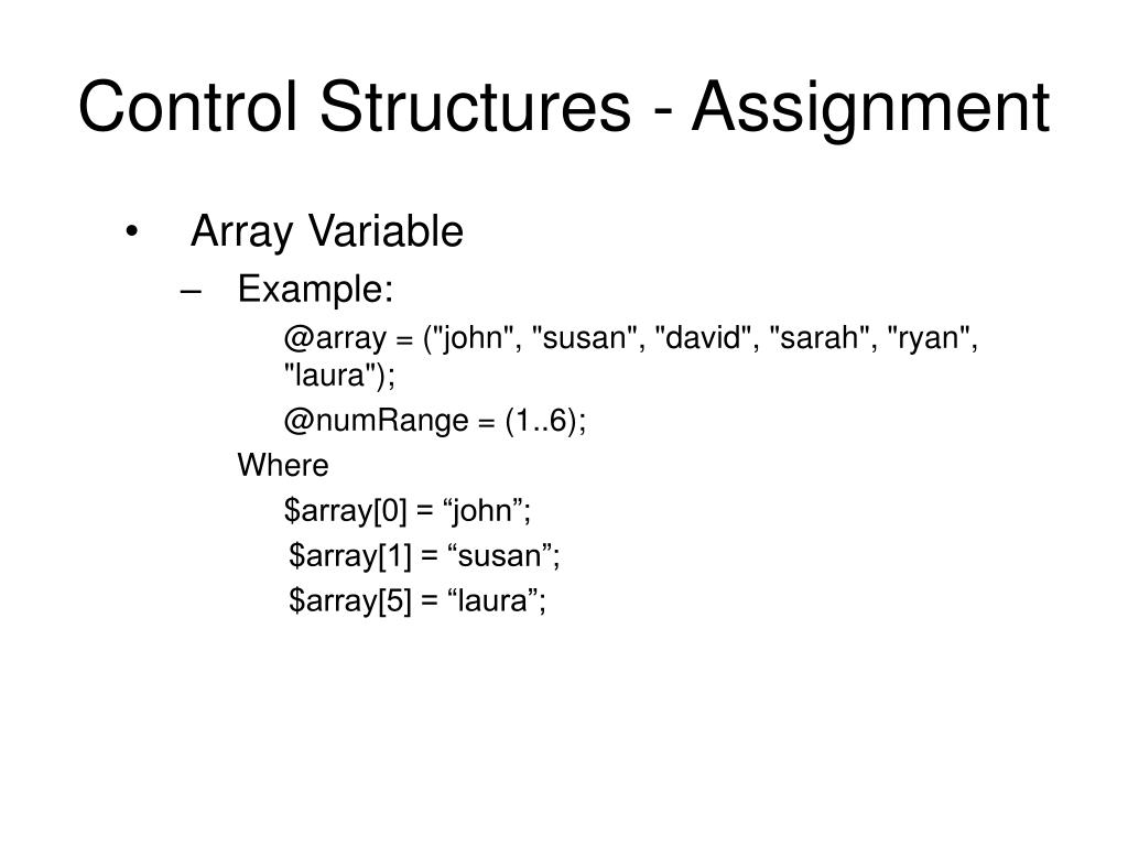Control Structures - Assignment • Array Variable • Example: @array = ("john", "susan", "david", "sarah", "ryan", "laura"); @numRange = (1..6); Where $array[0] = “john”; $array[1] = “susan”; $array[5] = “laura”;
