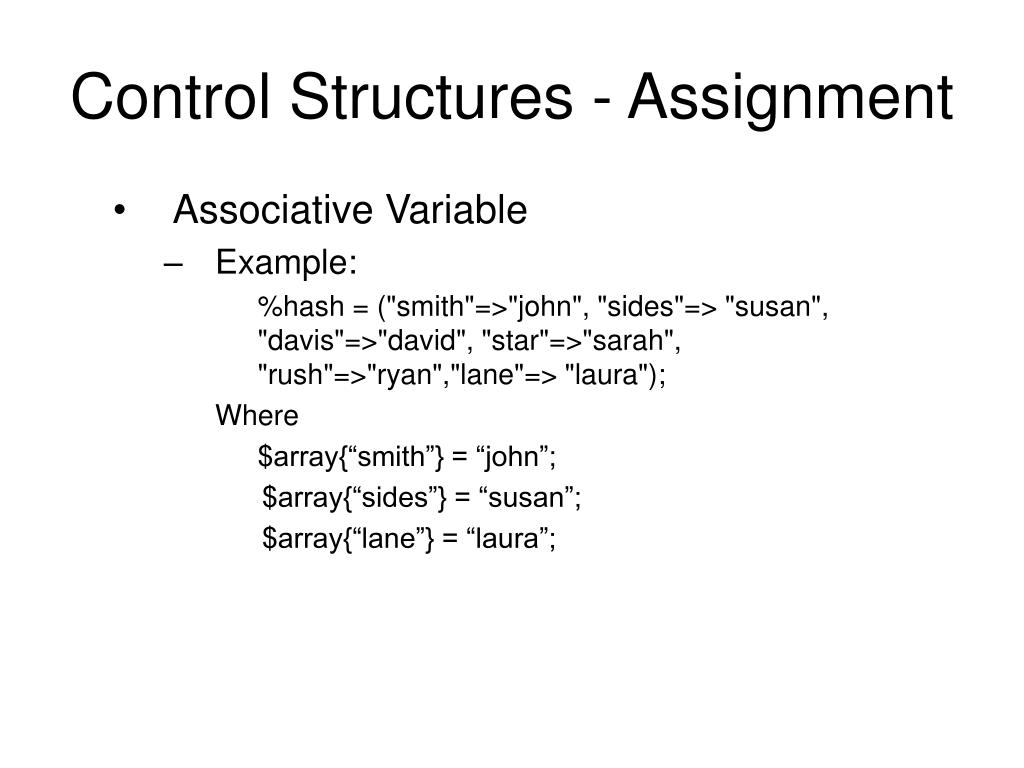 Control Structures - Assignment • Associative Variable • Example: %hash = ("smith"=>"john", "sides"=> "susan", "davis"=>"david", "star"=>"sarah", "rush"=>"ryan","lane"=> "laura"); Where $array{“smith”} = “john”; $array{“sides”} = “susan”; $array{“lane”} = “laura”;