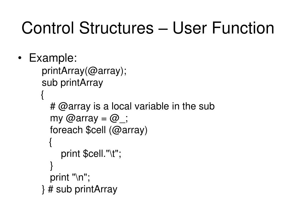 Control Structures – User Function • Function definition: • Syntax: sub functionname { my $localVar1 = $_[0]; my $localVar2 = $_[1]; my @localArray = @_; }