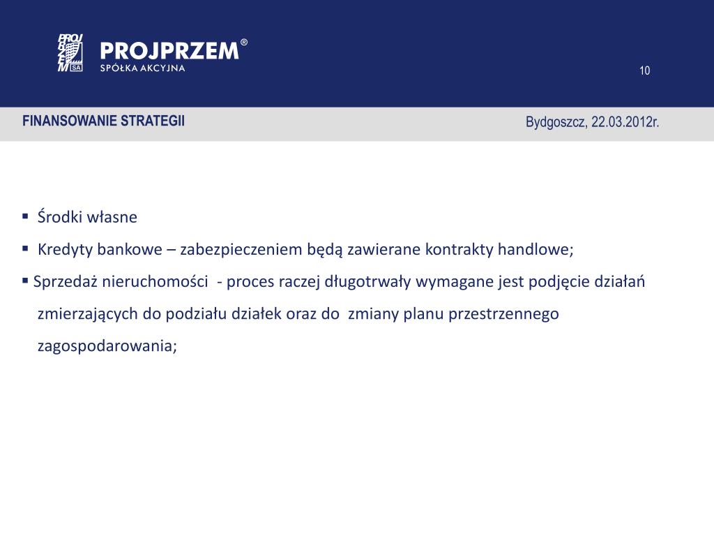 FINANSOWANIE STRATEGII Bydgoszcz, 22.03.2012r. • Środki własne • Kredyty bankowe – zabezpieczeniem będą zawierane kontrakty handlowe; • Sprzedaż nieruchomości - proces raczej długotrwały wymagane jest podjęcie działań • zmierzających do podziału działek oraz do zmiany planu przestrzennego • zagospodarowania;