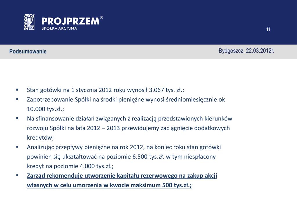 Bydgoszcz, 22.03.2012r. Podsumowanie • Stan gotówki na 1 stycznia 2012 roku wynosił 3.067 tys. zł.; • Zapotrzebowanie Spółki na środki pieniężne wynosi średniomiesięcznie ok 10.000 tys.zł.; • Na sfinansowanie działań związanych z realizacją przedstawionych kierunków rozwoju Spółki na lata 2012 – 2013 przewidujemy zaciągnięcie dodatkowych kredytów; • Analizując przepływy pieniężne na rok 2012, na koniec roku stan gotówki powinien się ukształtować na poziomie 6.500 tys.zł. w tym niespłacony kredyt na poziomie 4.000 tys.zł.; • Zarząd rekomenduje utworzenie kapitału rezerwowego na zakup akcji własnych w celu umorzenia w kwocie maksimum 500 tys.zł.;
