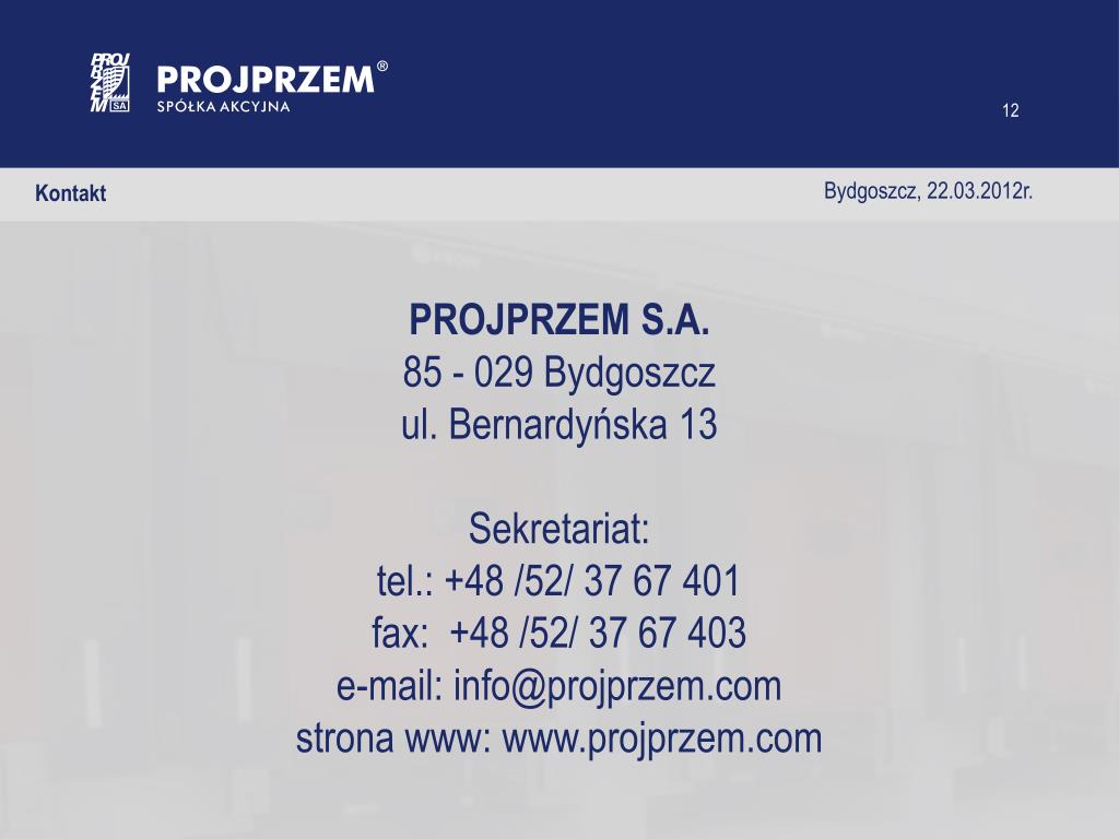 Bydgoszcz, 22.03.2012r. Kontakt PROJPRZEM S.A.85 - 029 Bydgoszczul. Bernardyńska 13 Sekretariat:tel.: +48 /52/ 37 67 401 fax: +48 /52/ 37 67 403 e-mail: info@projprzem.com strona www: www.projprzem.com
