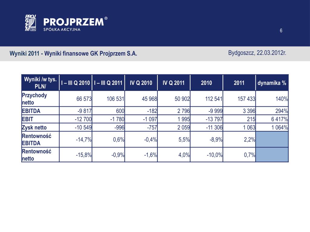 Bydgoszcz, 22.03.2012r. Wyniki 2011 - Wyniki finansowe GK Projprzem S.A.