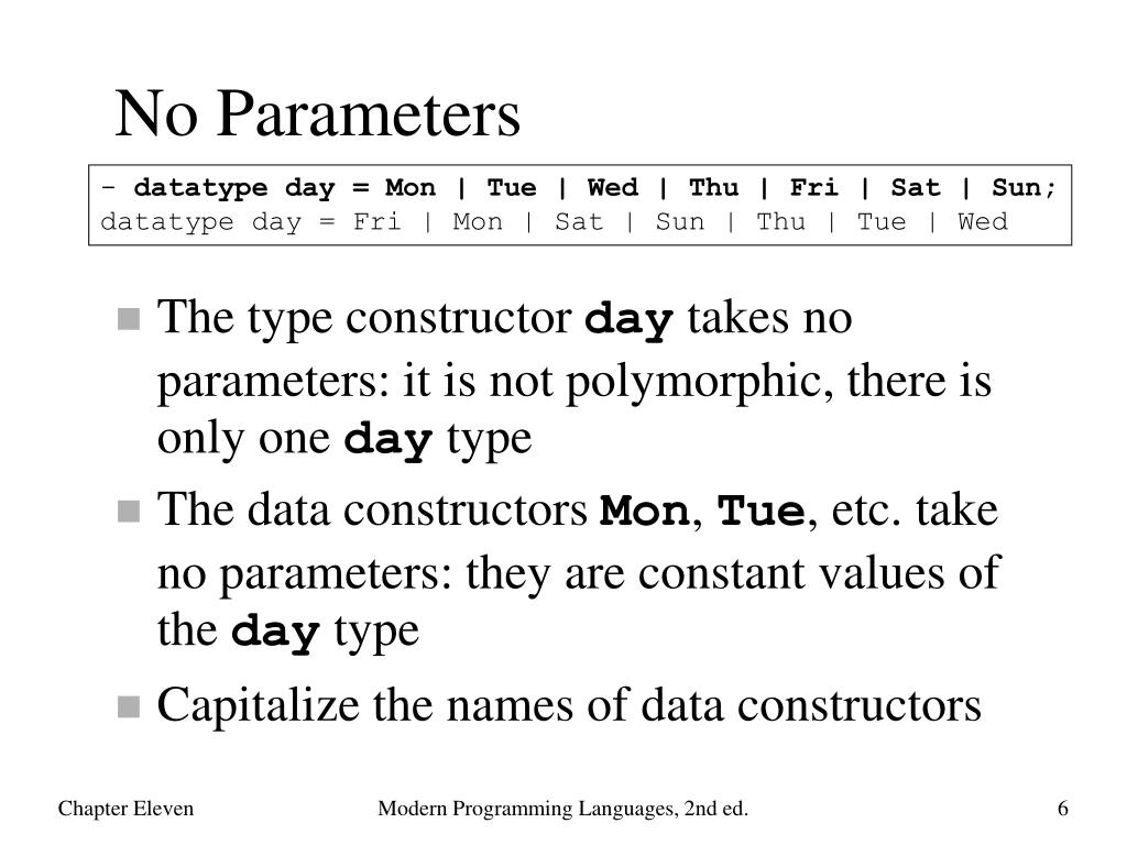 No Parameters - datatype day = Mon | Tue | Wed | Thu | Fri | Sat | Sun;datatype day = Fri | Mon | Sat | Sun | Thu | Tue | Wed • The type constructor day takes no parameters: it is not polymorphic, there is only one day type • The data constructors Mon, Tue, etc. take no parameters: they are constant values of the day type • Capitalize the names of data constructors Modern Programming Languages, 2nd ed.
