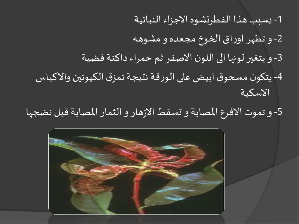 1- يسبب هذا الفطرتشوه الاجزاء النباتية 2- و تظهر اوراق الخوخ مجعده و مشوهه 3- و يتغير لونها الى اللون الاصفر ثم حمراء داكنة فضية 4- يتكون مسحوق ابيض على الورقة نتيجة تمزق الكيوتينوالاكياسالاسكية 5- و تموت الافرع المصابة و تسقط الازهار و الثمار المصابة قبل نضجها