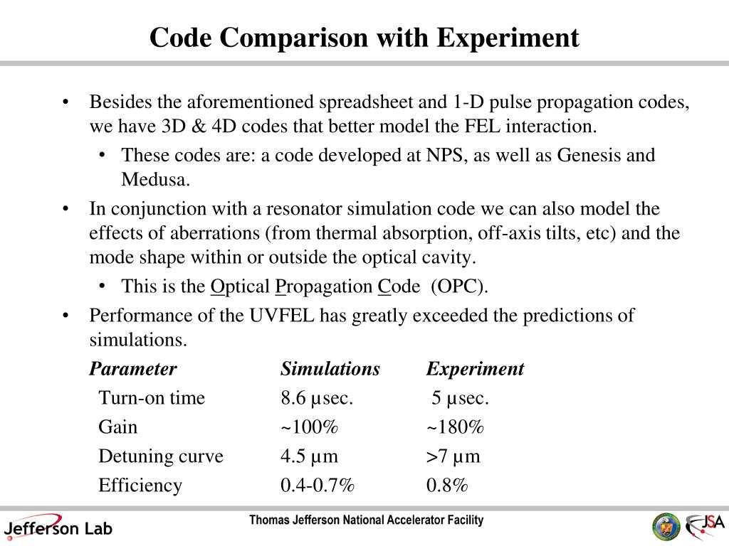 Code Comparison with Experiment • Besides the aforementioned spreadsheet and 1-D pulse propagation codes, we have 3D & 4D codes that better model the FEL interaction. • These codes are: a code developed at NPS, as well as Genesis and Medusa. • In conjunction with a resonator simulation code we can also model the effects of aberrations (from thermal absorption, off-axis tilts, etc) and the mode shape within or outside the optical cavity. • This is the Optical Propagation Code (OPC). • Performance of the UVFEL has greatly exceeded the predictions of simulations. Parameter Simulations Experiment Turn-on time 8.6 µsec. 5 µsec. Gain ~100% ~180% Detuning curve 4.5 µm >7 µm Efficiency 0.4-0.7% 0.8%
