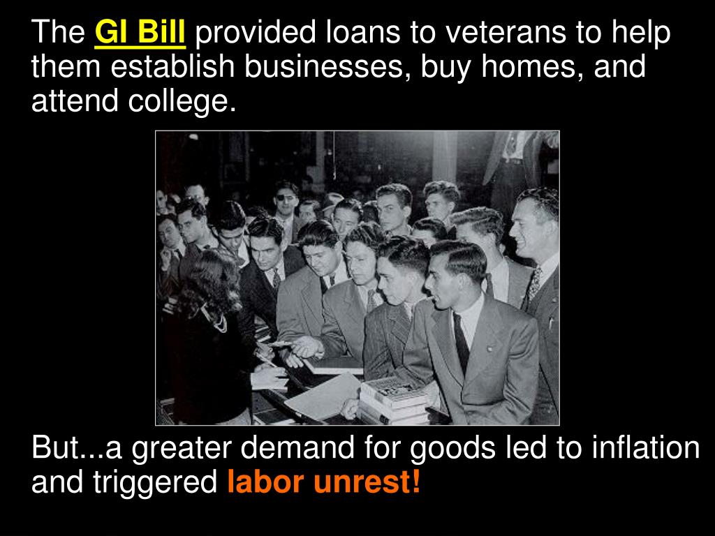 The GI Billprovided loans to veterans to help them establish businesses, buy homes, and attend college. But...a greater demand for goods led to inflation and triggered labor unrest! GI Bill