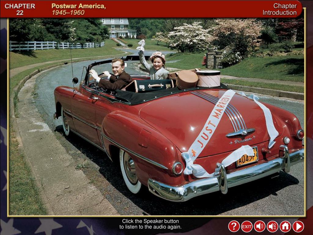 Postwar America 1945-1960 Chapter 22. Click the Speaker button to listen to the audio again. Intro 1. Why It Matters Post-WWII: * Economic prosperity * Stronger middle class * House in the suburbs * More leisure time * Television - favorite entertainment