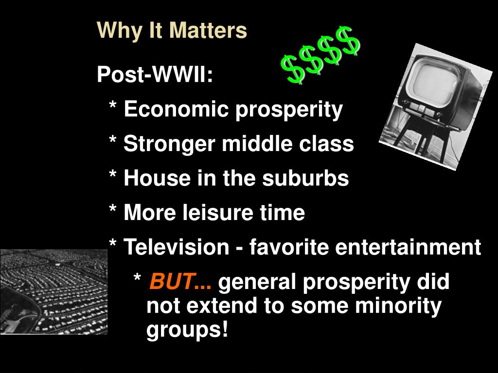 Why It Matters Post-WWII: * Economic prosperity * Stronger middle class * House in the suburbs * More leisure time * Television - favorite entertainment * BUT... general prosperity did not extend to some minority groups! $$$$ Intro 7