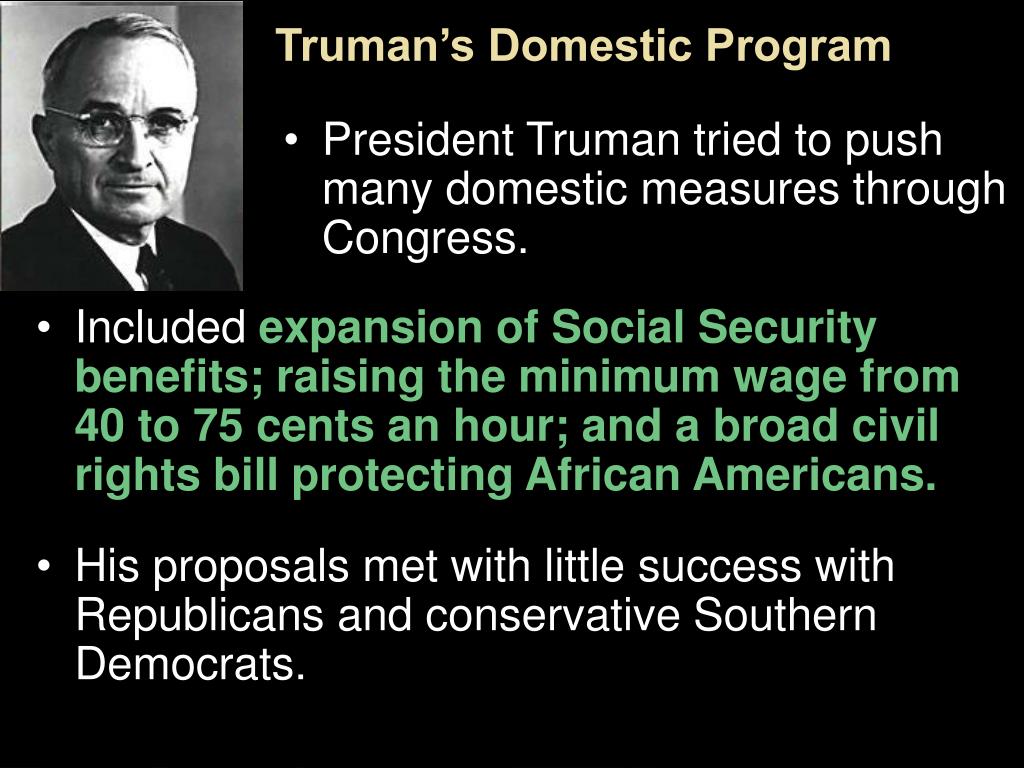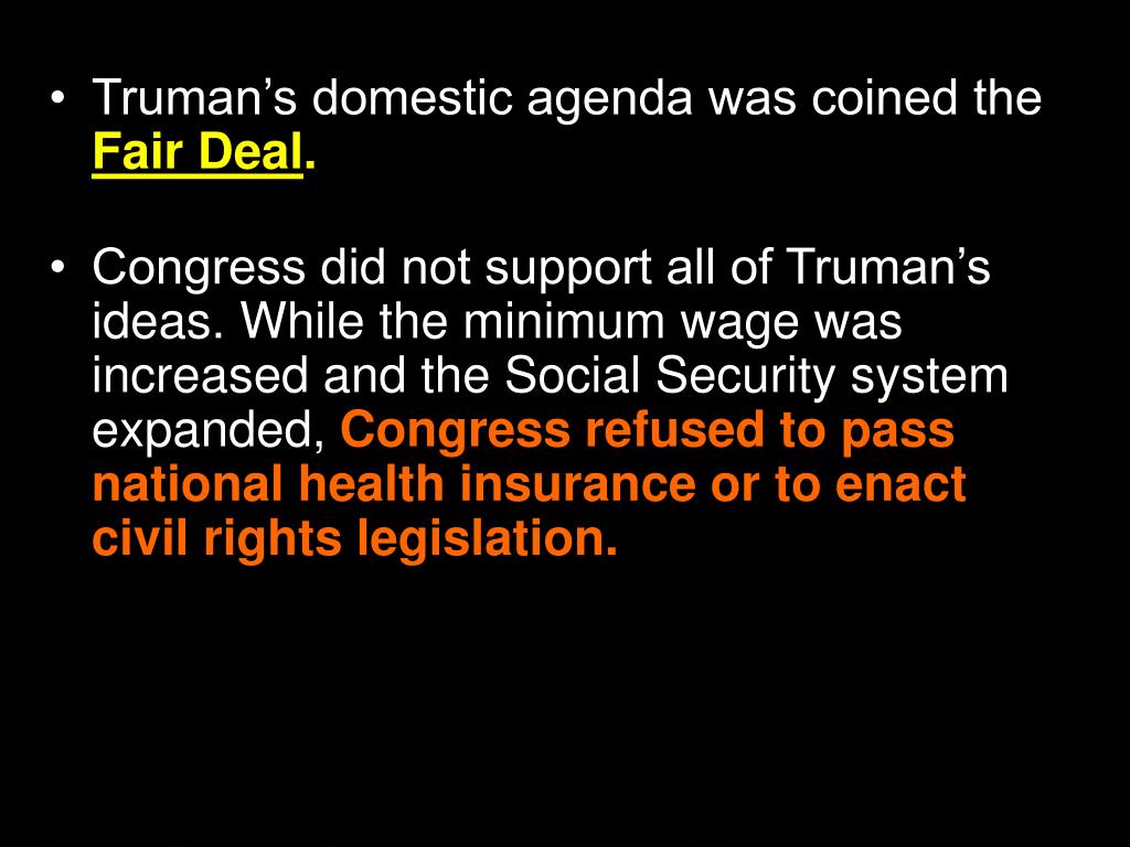 Truman’s domestic agenda was coined the Fair Deal. • Congress did not support all of Truman’s ideas. While the minimum wage was increased and the Social Security system expanded, Congress refused to pass national health insurance or to enact civil rights legislation. Section 1-11