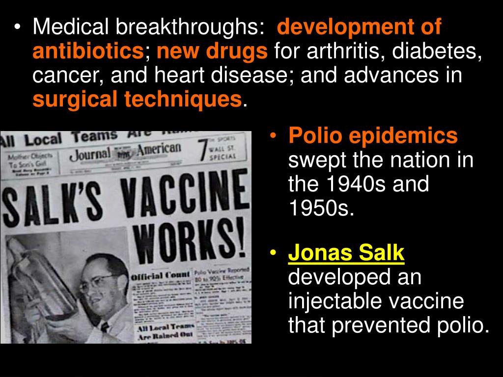 Medical breakthroughs: development of antibiotics; new drugs for arthritis, diabetes, cancer, and heart disease; and advances in surgical techniques. • Polio epidemics swept the nation in the 1940s and 1950s. • Jonas Salk developed an injectable vaccine that prevented polio. Section 2-15
