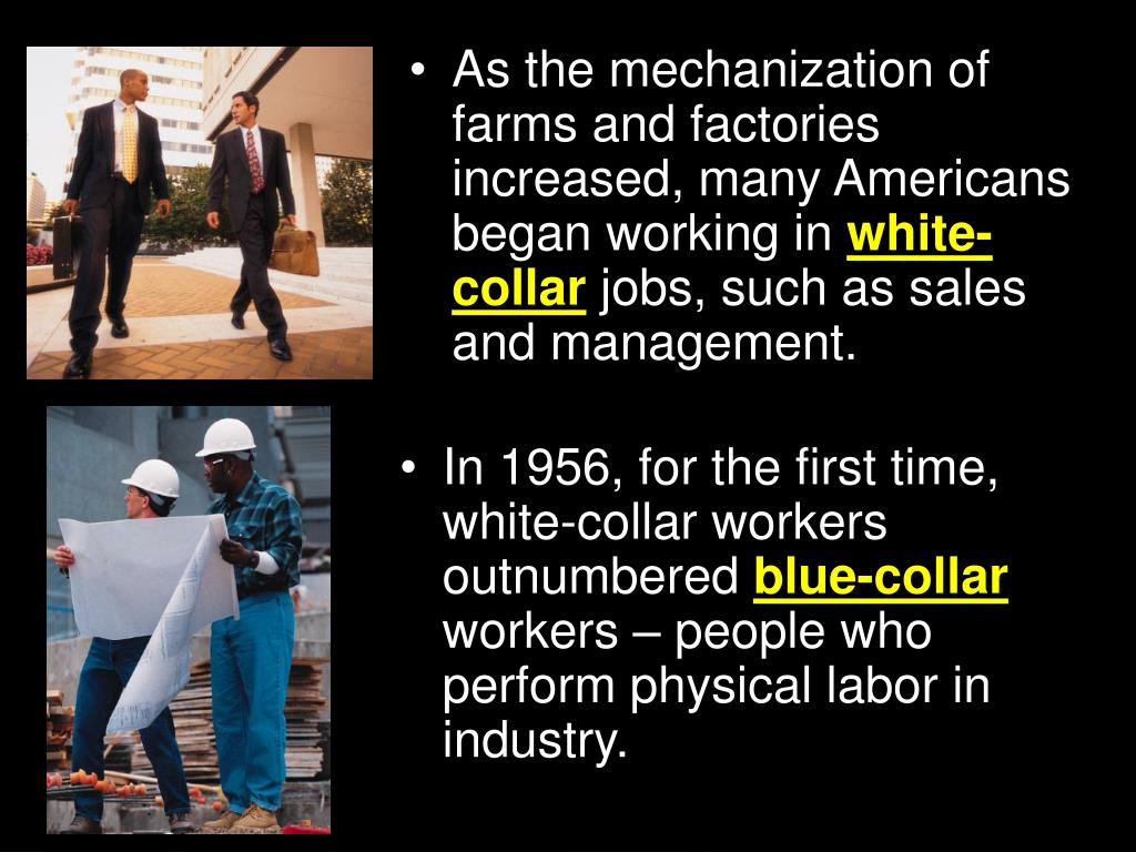 As the mechanization of farms and factories increased, many Americans began working in white-collarjobs, such as sales and management. • In 1956, for the first time, white-collar workers outnumbered blue-collarworkers – people who perform physical labor in industry. Section 2-6