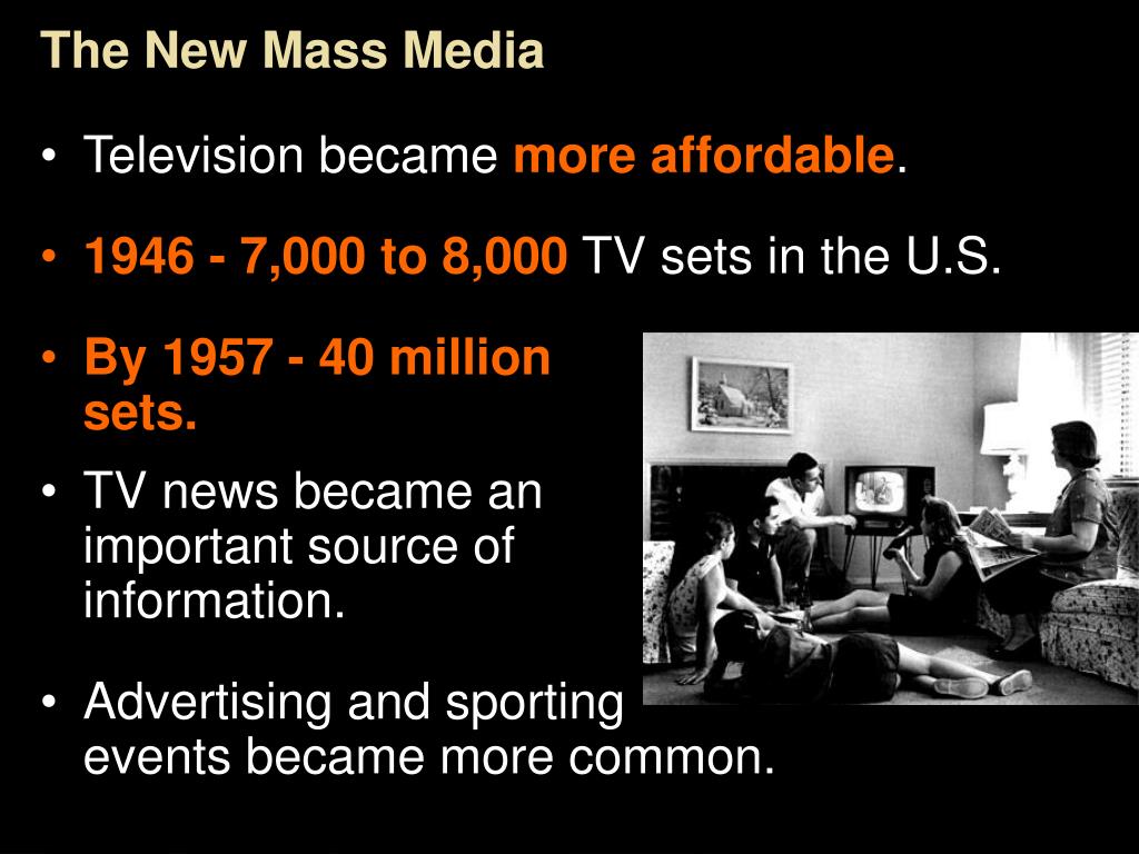 The New Mass Media • Television became more affordable. • 1946 - 7,000 to 8,000 TV sets in the U.S. • By 1957 - 40 million sets. • TV news became an important source of information. • Advertising and sporting events became more common. Section 3-5