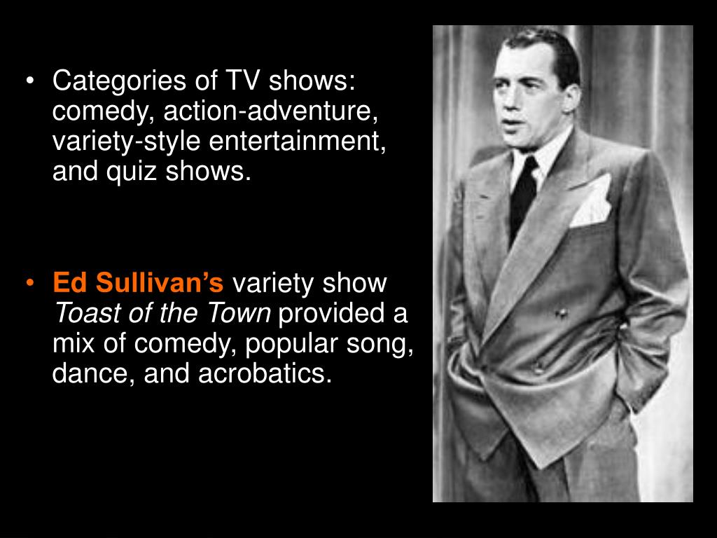Categories of TV shows: comedy, action-adventure, variety-style entertainment, and quiz shows. • EdSullivan’svariety show Toast of the Town provided a mix of comedy, popular song, dance, and acrobatics. Section 3-6