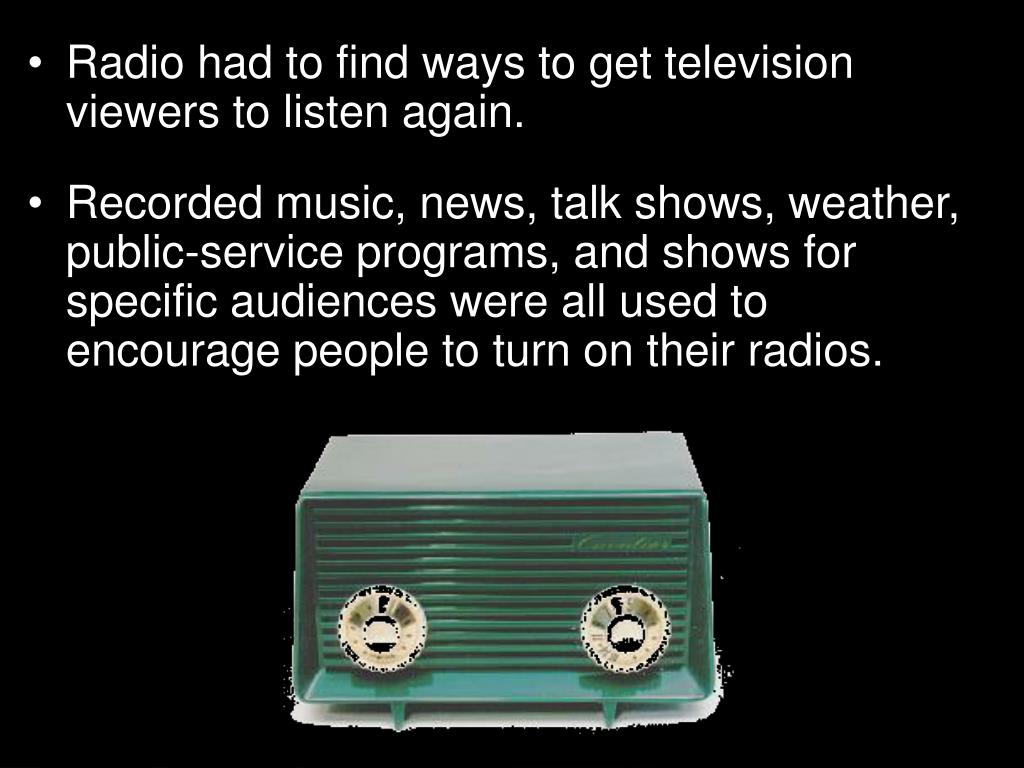 Radio had to find ways to get television viewers to listen again. • Recorded music, news, talk shows, weather, public-service programs, and shows for specific audiences were all used to encourage people to turn on their radios. Section 3-7