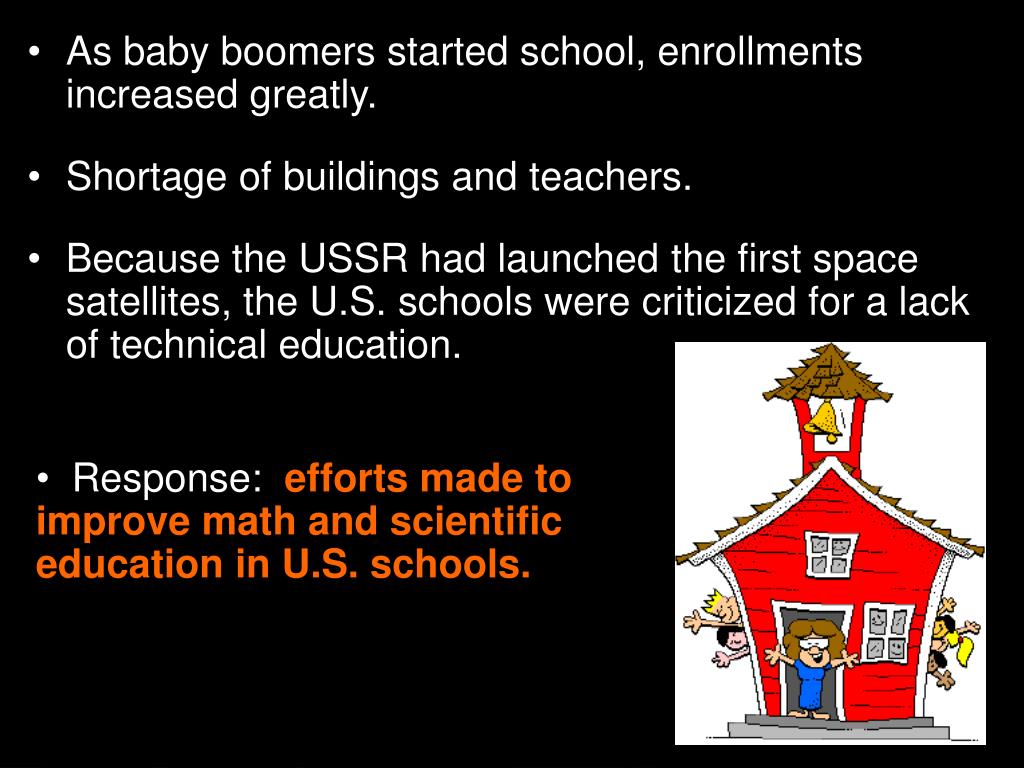 As baby boomers started school, enrollments increased greatly. • Shortage of buildings and teachers. • Because the USSR had launched the first space satellites, the U.S. schools were criticized for a lackof technical education. • Response: efforts made to improve math and scientific education in U.S. schools. Section 4-10