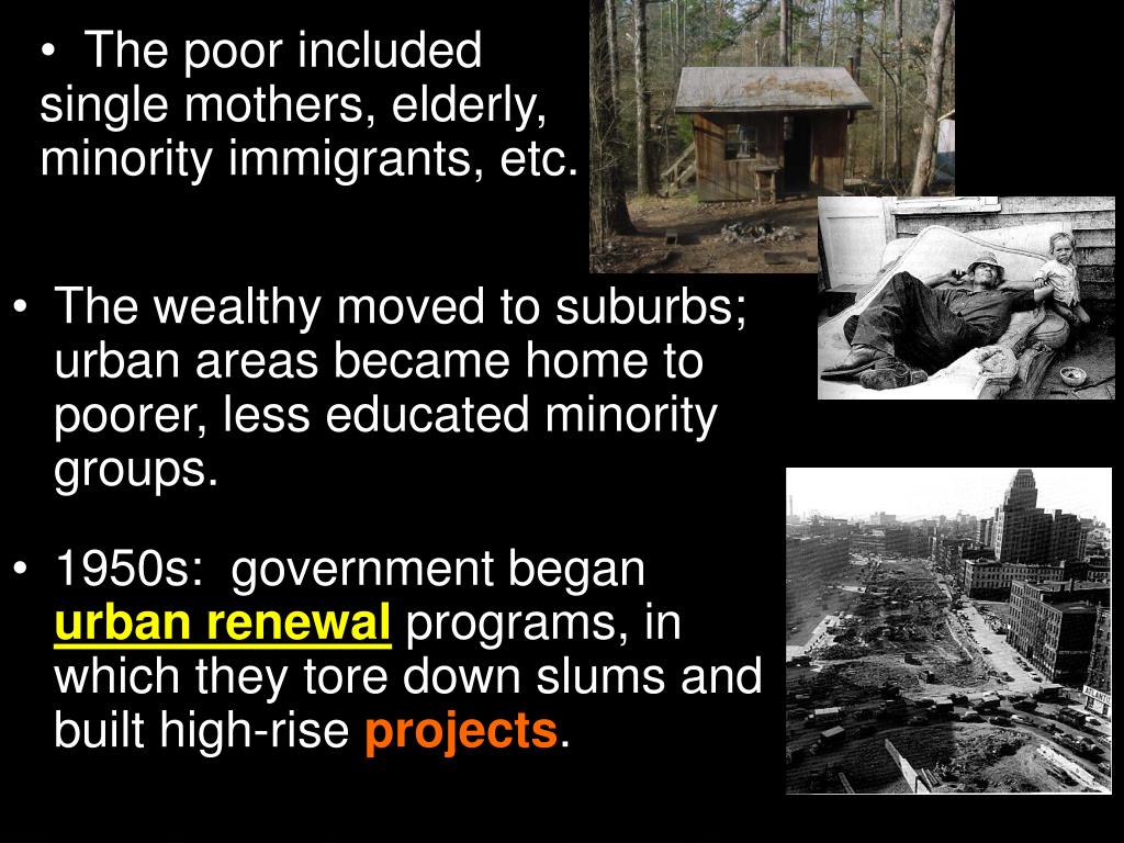 The poor included single mothers, elderly, minority immigrants, etc. • The wealthy moved to suburbs; urban areas became home to poorer, less educated minority groups. • 1950s: government began urban renewal programs, in which they tore down slums and built high-rise projects. Section 4-6