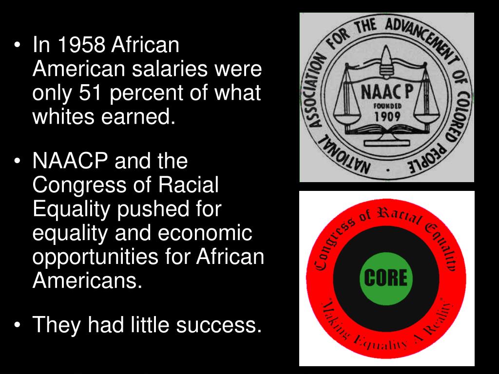 In 1958 African American salaries were only 51 percent of what whites earned. • NAACP and the Congress of Racial Equality pushed for equality and economic opportunities for African Americans. • They had little success. Section 4-7