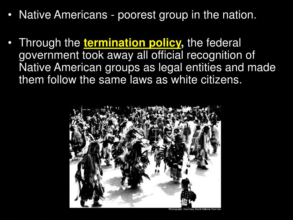 Native Americans - poorest group in the nation. • Through the termination policy, the federal government took away all official recognition of Native American groups as legal entities and made them follow the same laws as white citizens. Section 4-7