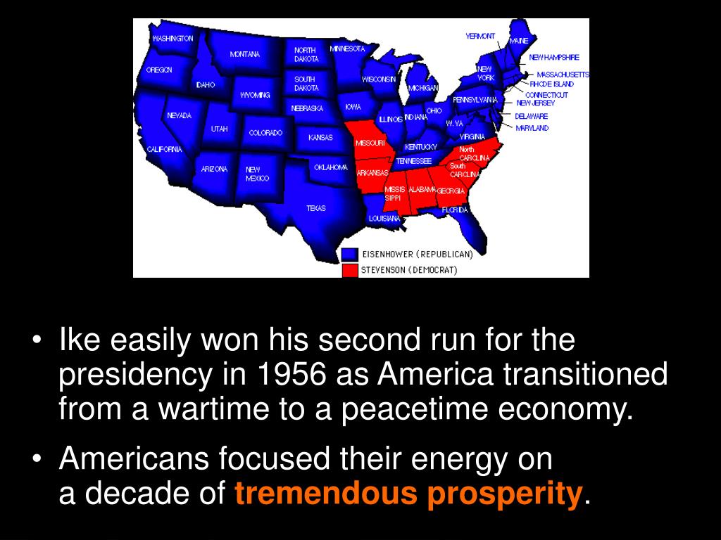 Ike easily won his second run for the presidency in 1956 as America transitioned from a wartime to a peacetime economy. • Americans focused their energy on a decade of tremendous prosperity.