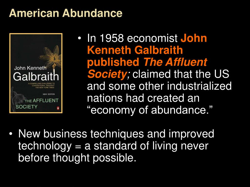American Abundance • In 1958 economist John Kenneth Galbraithpublished The Affluent Society; claimed that the US and some other industrialized nations had created an “economy of abundance.” • New business techniques and improved technology = a standard of living never before thought possible.