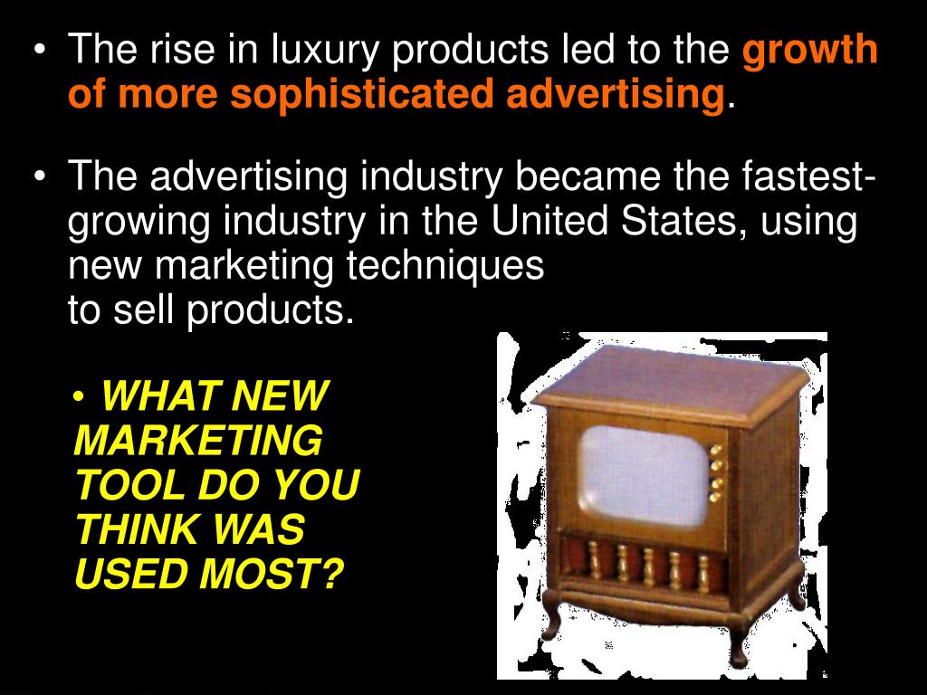 The rise in luxury products led to the growth of more sophisticated advertising. • The advertising industry became the fastest-growing industry in the United States, using new marketing techniques to sell products. • WHAT NEW MARKETING TOOL DO YOU THINK WAS USED MOST?