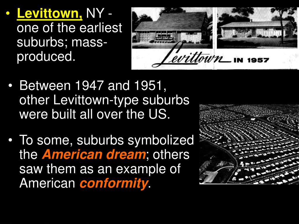 Levittown, NY - one of the earliest suburbs; mass-produced. • Between 1947 and 1951, other Levittown-type suburbs were built all over the US. • To some, suburbs symbolized the American dream; others saw them as an example of American conformity.