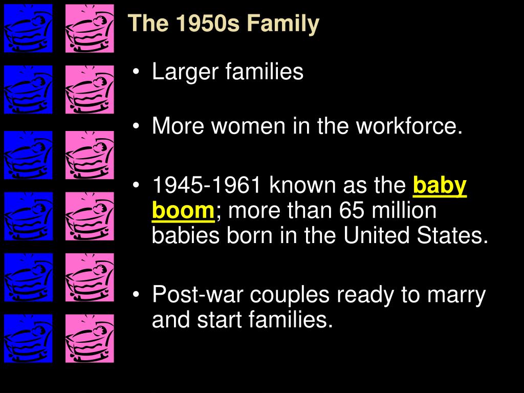 The 1950s Family • Larger families • More women in the workforce. • 1945-1961 known as the baby boom; more than 65 million babies born in the United States. • Post-war couples ready to marry and start families.