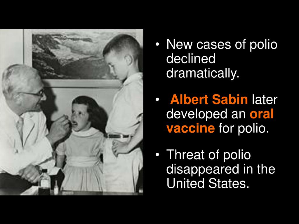 New cases of polio declined dramatically. • Albert Sabinlater developed an oral vaccine for polio. • Threat of polio disappeared in the United States.