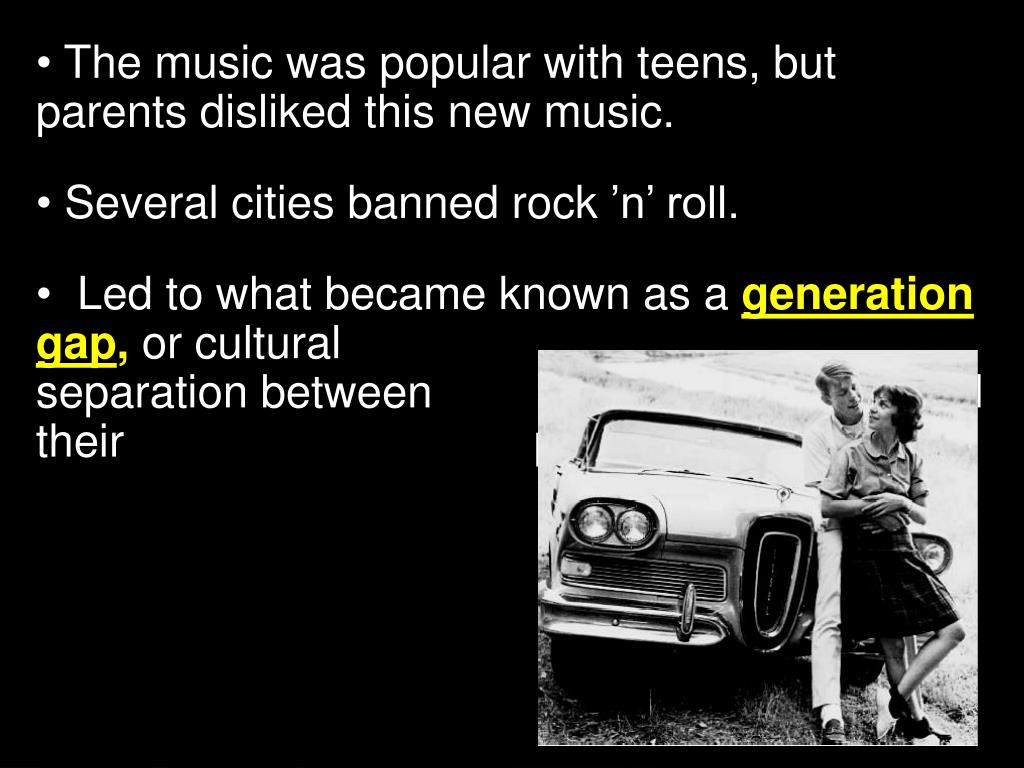 The music was popular with teens, but parents disliked this new music. • Several cities banned rock ’n’ roll. • Led to what became known as a generation gap, or cultural separation between children and their parents.