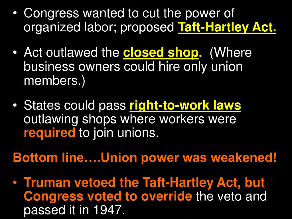 Congresswanted to cut the power of organized labor; proposed Taft-Hartley Act. • Act outlawed the closed shop. (Where business owners could hire only union members.) • States could pass right-to-work laws outlawing shops where workers were required to join unions. • Bottom line….Union power was weakened! • Truman vetoed the Taft-Hartley Act, but Congress voted to override the veto and passed it in 1947.