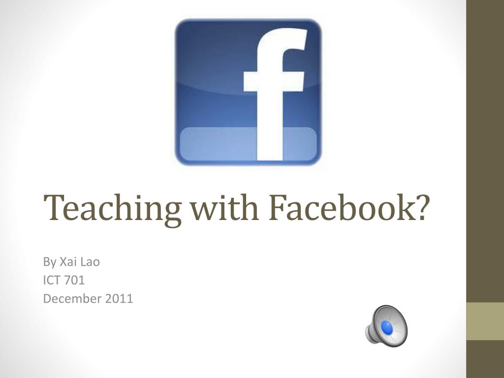 Teaching with Facebook?. By Xai Lao ICT 701 December 2011. Teaching with Facebook?. Purpose of Research. Facebook can be a educational teaching tool Enhance and motivate learning Popular trend among millions of users Many capabilities to offer. Teaching with Facebook?. Introduction.