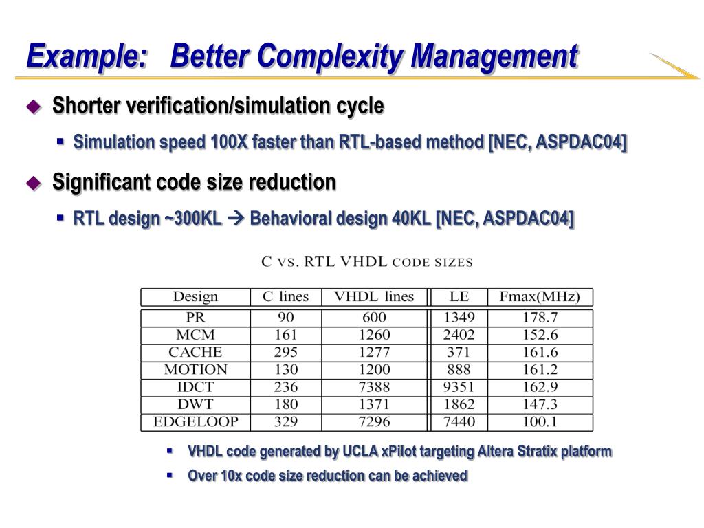 Example: Better Complexity Management • Shorter verification/simulation cycle • Simulation speed 100X faster than RTL-based method [NEC, ASPDAC04] • Significant code size reduction • RTL design ~300KL Behavioral design 40KL [NEC, ASPDAC04] • VHDL code generated by UCLA xPilot targeting Altera Stratix platform • Over 10x code size reduction can be achieved